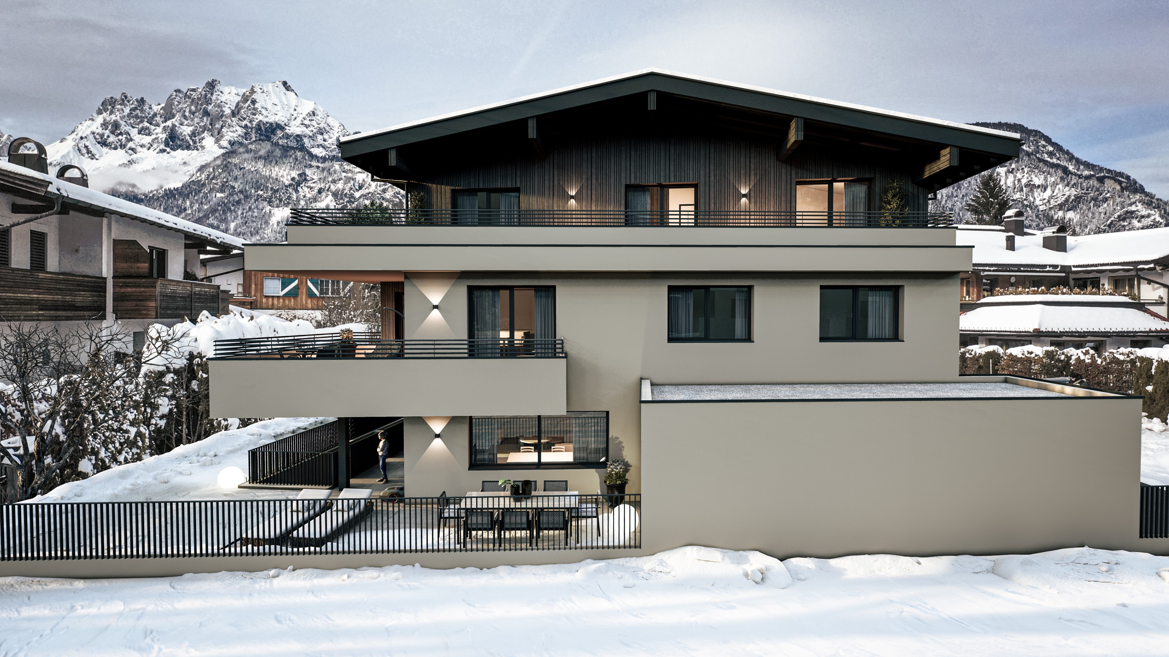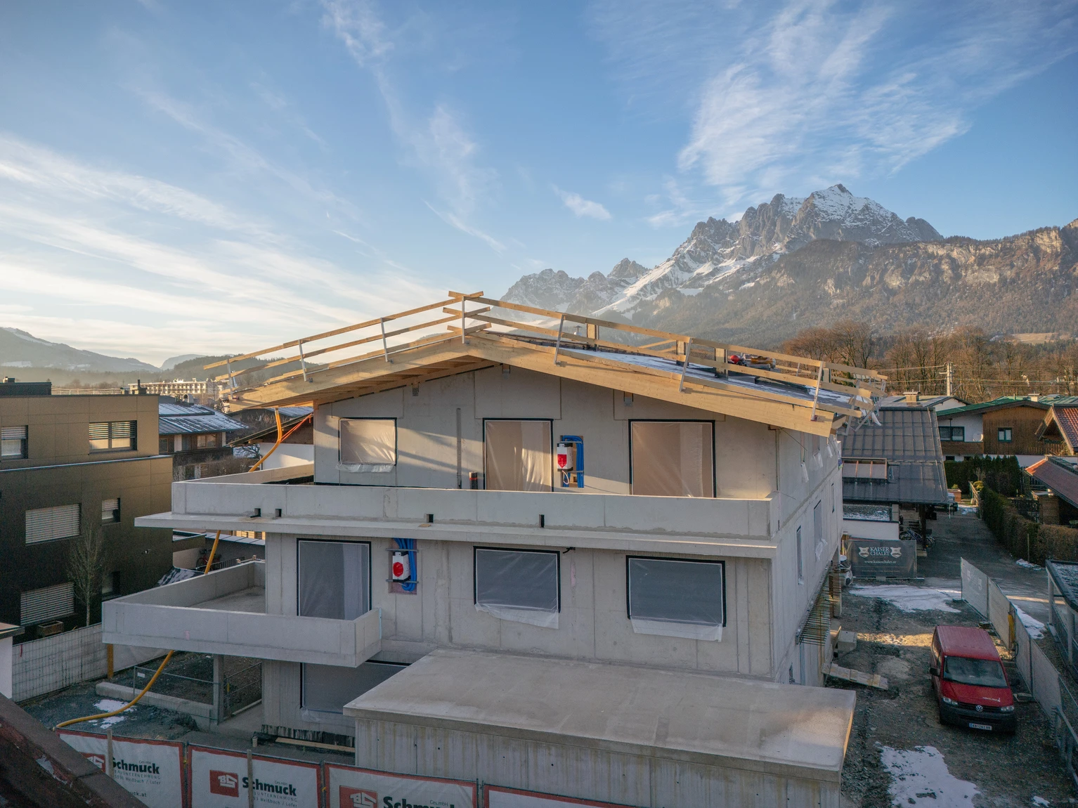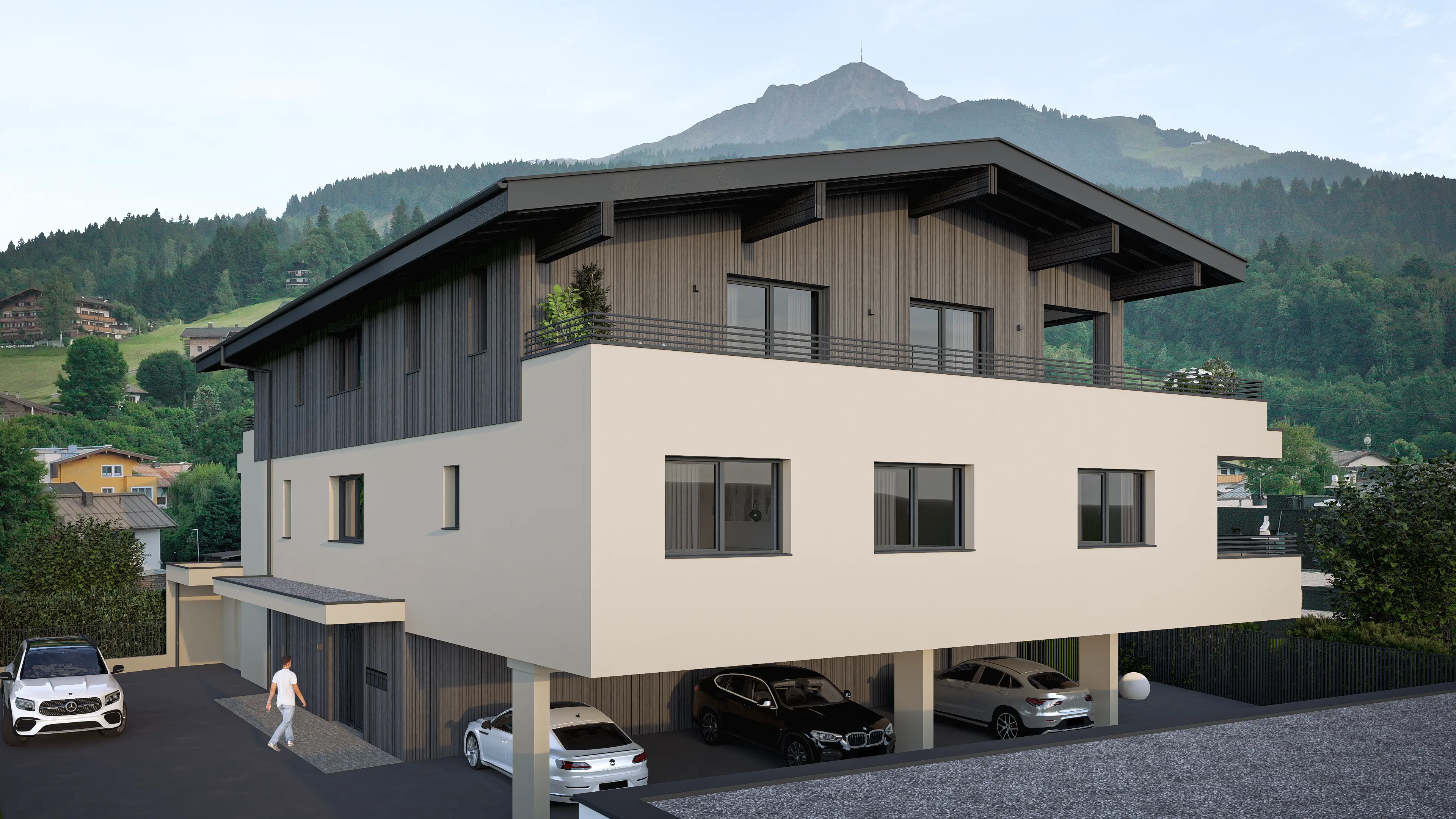 In sonniger Lage von St. Johann entstehen die Mountain Homes Hornblick – eine kleine, exklusive Wohnanlage mit lichtdurchfluteten Einheiten und freiem Blick auf das Kitzbüheler Horn und den Wilden Kaiser. Moderne Architektur im traditionellen Stil, großzügige Außenflächen und hochwertige Ausstattung schaffen ein harmonisches Wohngefühl, das die alpine Umgebung respektvoll in Szene setzt.